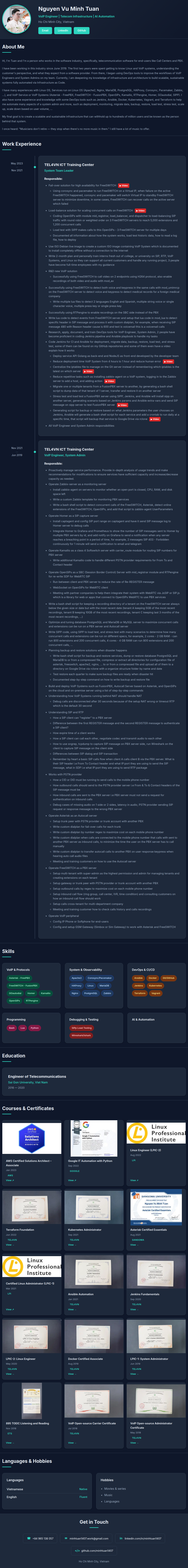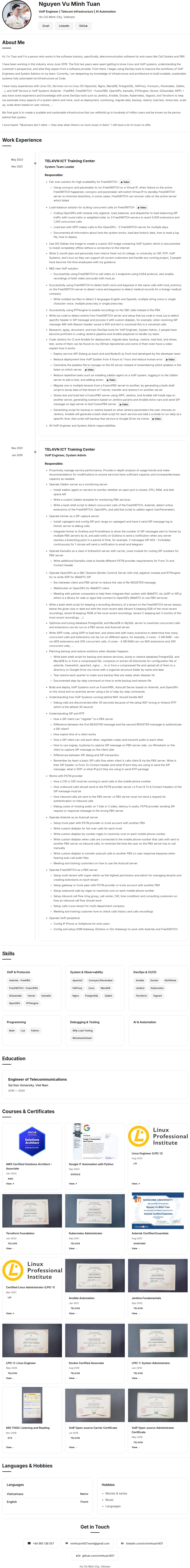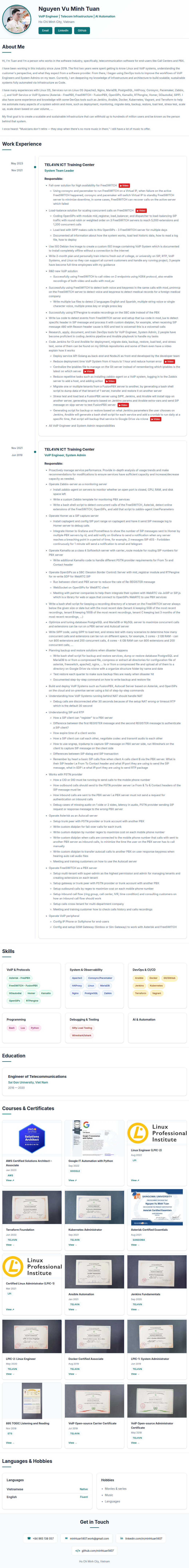 I have many experiences with Linux OS, Services run on Linux OS (Apache2, Nginx, MariaDB, PostgreSQL, HAProxy, Corosync, Pacemaker, Zabbix, ...), and VoIP Service or VoIP Systems (Asterisk - FreePBX, FreeSWITCH - FusionPBX, OpenSIPs, Kamailio, RTPengine, Homer, GOautodial, SIPP). I also have some experience and knowledge with some DevOps tools such as Jenkins, Ansible, Docker, Kubernetes, Vagrant, and Terraform to help me automate many aspects of a system admin and more, such as deployment, monitoring, migrate data, backup, restore, load test, stress test, scale up, scale down based on user volume, ...